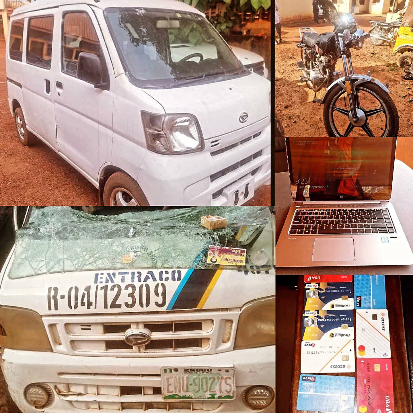 Meanwhile, on August 30 at about 8:00 p.m., police officers from the Nsukka Urban Division rescued and arrested Friday Nwaomege (25) from a mob after he and two accomplices, still at large, allegedly snatched an ATM card from a victim along Enugu Road, Nsukka. The suspect sustained injuries from the mob before police intervention. A total of twelve ATM cards and an ENTRACO-branded minibus (Reg. No. ENU 902 YS), used during the operation, were recovered. The vehicle was reportedly damaged by the mob.